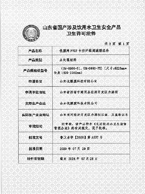 2020年7月29日,優(yōu)膜牌PVDF中空纖維超濾膜組件獲批“山東省國產(chǎn)涉及飲用水衛(wèi)生安全產(chǎn)品衛(wèi)生許可批件”證書,產(chǎn)品符合國家規(guī)范和標(biāo)準(zhǔn)。山東